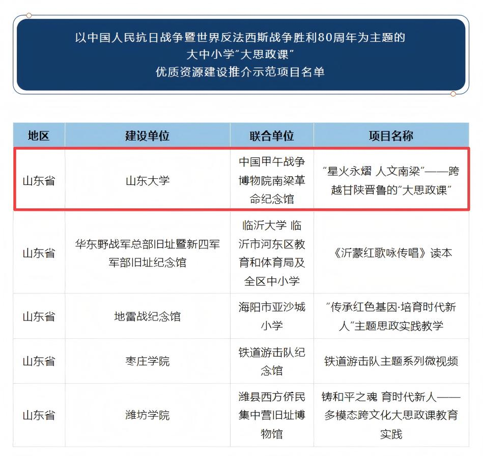 近日,由教育部、国家文物局联合组织开展的以中国人民抗日战争暨世界反法西斯战争胜利80周年为主题的大中小学“大思政课”优质资源建设推广工作评选结果正式公布,山东大学历史学院、考古学院与南梁革命纪念馆联合申报的《“星火永熠 人文南梁”——跨越甘陕晋鲁的“大思政课”》入选精品项目名单。