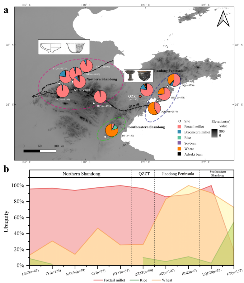 前冢子头遗址的植物考古证据显示,不同时期的作物组合呈现显著动态变化:大汶口晚期至龙山时期(距今约5000–4000年)为以粟为主导、水稻为补充的混合体系。岳石文化时期(距今约4000–3000年)转向以耐旱的粟黍为核心的旱作模式,并保留少量水稻的种植。周代(距今约3000–2200年)的作物组合则以粟为核心、逐步引入小麦且豆类种植稳定,完整呈现了过渡地带的农业适应轨迹。