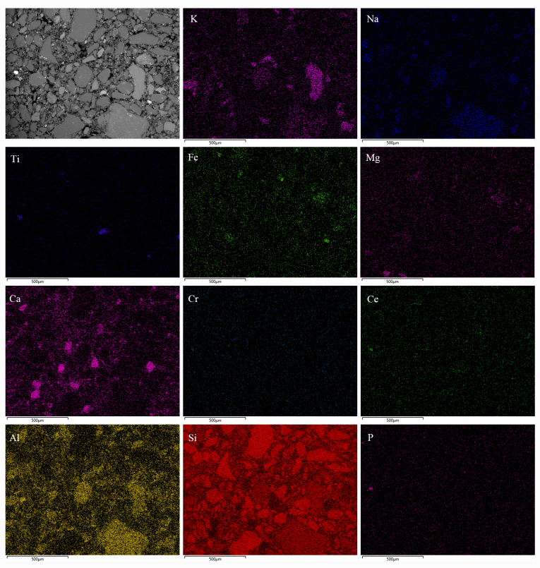 化学元素的分析结果显示陶工在黏土的原料使用上具有极强的延续性,几乎看不到随时代的变化。虽然高钙黏土一直都被使用,但不是黏土原料的主要来源。陶工在取土时没有因器物的功能不同而选择不同的黏土(图4)。样品化学成分分析显示部分样品中有含铈元素(Ce)的矿物颗粒。对于土壤样品的面扫描也发现了铈(Ce)元素的存在(图5)。可见青邱附近的土壤中普遍存在该元素。这说明所分析的样品应当均为本地生产。